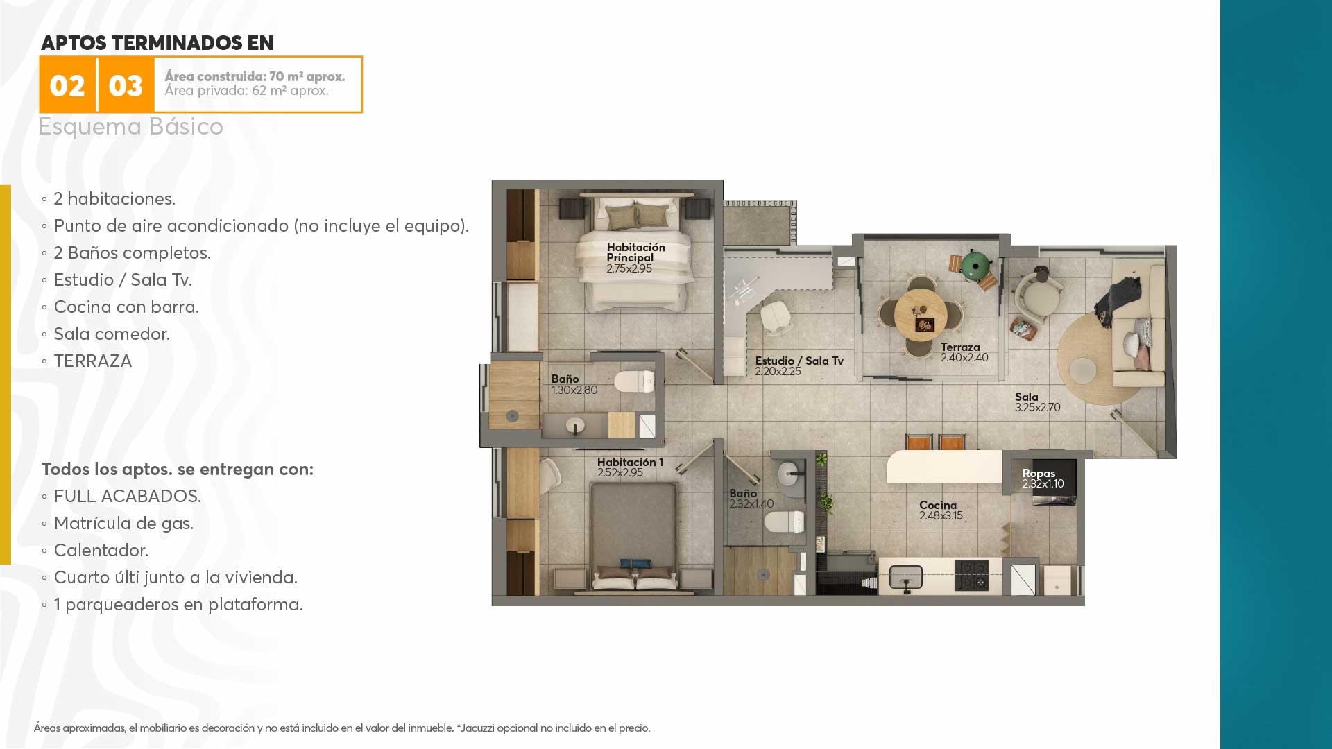 Todos los aptos. se entregan con: - FULL ACABADOS. - Matrícula de gas. - Calentador. - Cuarto últi junto a la vivienda. - 1 parqueaderos en plataforma.